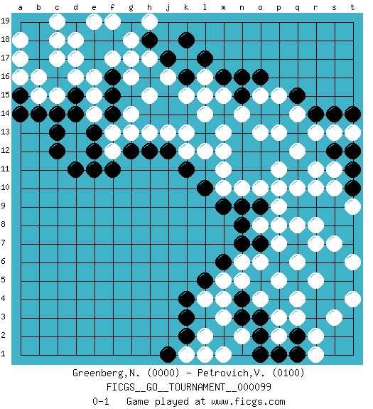 Last move : 0-1 2022 November 21 23:49:20 [Event "FICGS__GO__TOURNAMENT__000099"] [Site "FICGS"] [Date "2022.03.23"] [Round "1"] [Black "Greenberg,Normund"] [White "Petrovich,Valery"] [Result "0-1"] [Rating 1 "0000"] [Rating 2 "0100"] 1.k16 q4 2.r3 q3 3.r4 r5 4.s5 q6 5.p6 p5 6.q2 p2 7.r6 p7 8.o7 o6 9.q5 r7 10.p4 r5 11.s6 s7 12.s8 r8 13.q9 q8 14.p8 o8 15.n7 p9 16.o2 p3 17.o3 o4 18.n4 n5 19.p1 r2 20.q1 s3 21.s4 t4 22.t7 t6 23.t5 t6 24.t8 m4 25.n3 m3 26.l5 l4 27.m2 l2 28.l1 r1 29.o1 k1 30.k2 m1 31.k4 n2 32.k3 n6 33.j1 l1 34.m6 m5 35.o9 q10 36.r9 r10 37.s9 s10 38.t10 t9 39.t11 s11 40.n8 p8 41.q11 o10 42.n9 n10 43.o11 p11 44.p12 p10 45.s12 r11 46.n11 m10 47.l10 m11 48.m9 m12 49.n12 q12 50.q13 p13 51.o12 o13 52.n13 n14 53.n15 m13 54.m14 m15 55.m16 l14 56.l15 o15 57.n16 k15 58.j15 l16 59.l17 l15 60.k14 k13 61.j14 j13 62.o16 p15 63.q15 q14 64.r14 r13 65.s14 s13 66.t12 t13 67.t14 k17 68.k18 j16 69.h16 h15 70.h14 h13 71.h12 g14 72.f14 f13 73.e13 e14 74.f15 d13 75.e12 d12 76.d14 e15 77.f16 e16 78.e17 f17 79.d15 d16 80.f18 g17 81.c16 d17 82.e18 g16 83.d11 f12 84.e11 c15 85.c14 b15 86.b14 b16 87.b17 c17 88.c12 d18 89.c13 e19 90.g12 g18 91.j17 f19 92.k16 h17 93.f11 g13 94.k11 l12 95.j12 k12 96.a15 a16 97.a14 a17 98.b18 a18 99.b19 c19 100.a19 c18 101.h18 h19 0-1 This go game has been lost on time (started : 2022.03.23 7:39:57) Here are the names of the openings (joseki) played in the four corners : Corner q4 : q4 r3 Hoshi (Hwajeom, Seongjeom, Xingwei`) 4-4 Point. The star or hoshi (4-4) point, emphasizing influence at the potential expense of territory. Corner q16 : t11 s11 This joseki is unknown. A weak or weird move has probably been played in this corner. Player White won this Go (weiqi, baduk) game. Follow this game move after move (download)If your stone is capped, play the knight's move. (Anonymous) Bobby never cared about money, though. His only desire was to prove that his choices were correct: He wanted chess to be important because he was a chess player, and he wanted to be important. Bobby knew money was important, but he didn't have a clue why, outside of clothes and status. The only way he could accomplish what he wanted was to fight for a lot of money. Once he got it, he gave it away. He did not know how to spend it. And once he'd become champion, after, essentially, sacrificing his life for it, he didn't know how to spend his time. (Bob Wade)