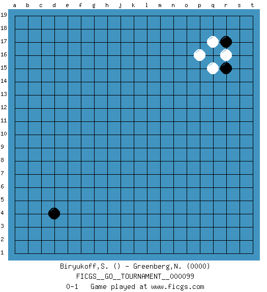 Last move : 0-1 2022 April 28 7:30:8 [Event "FICGS__GO__TOURNAMENT__000099"] [Site "FICGS"] [Date "2022.03.23"] [Round "1"] [Black "Biryukoff,Sergey"] [White "Greenberg,Normund"] [Result "0-1"] [Rating 2 "0000"] 1.q16 q17 2.d4 r16 3.r17 p16 4.r15 q15 0-1 This go game has been lost on time (started : 2022.03.23 7:39:57) Here are the names of the openings (joseki) played in the four corners : Corner q16 : q16 q17 Hoshi (Hwajeom, Seongjeom, Xingwei`) 4-4 Point. The star or hoshi (4-4) point, emphasizing influence at the potential expense of territory. Player White won this Go (weiqi, baduk) game. Follow this game move after move (download)With only one group, you will win. (Anonymous) The Internet is the first thing that humanity has build that humanity doesn't understand, the largest experiment in anarchy that we have ever had. (Eric Schmidt)