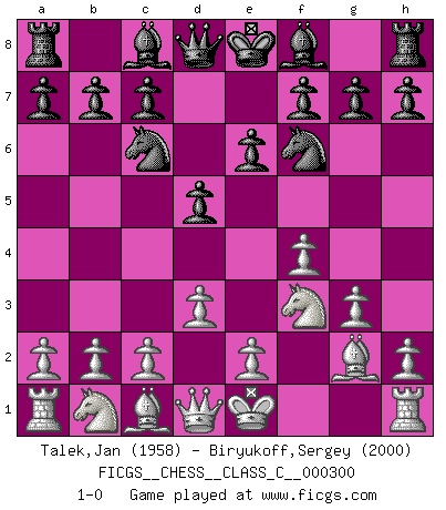 Last move : 1-0 2022 May 4 11:57:4 [Event "FICGS__CHESS__CLASS_C__000300"] [Site "FICGS"] [Date "2022.03.23"] [Round "1"] [White "Talek,Jan"] [Black "Biryukoff,Sergey"] [Result "1-0"] [WhiteElo "1958"] [BlackElo "2000"] 1.f4 d5 2.Nf3 Nf6 3.d3 Nc6 4.g3 e6 5.Bg2 1-0 This chess game has been lost on time (started : 2022.03.23 9:34:51) Bird's Opening Player White won this chess game. Follow this game move after move (download)What would Chess be without silly mistakes ? (Kurt Richter) Die jungen Leute sollen verstehen, dass sie noch etwas von mir lernen können und müssen. (Viktor Kortschnoi) Morphy probablemente fue el genio más grande de todos. (Bobby Fischer) A ce moment-là, je menaçais de comprendre la position ! (Clément L'Heureux) Experiences are the keys to life. (Daniel Parmet)