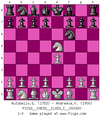 Last move : 1-0 2022 May 12 18:25:53 [Event "FICGS__CHESS__CLASS_C__000300"] [Site "FICGS"] [Date "2022.03.23"] [Round "1"] [White "Autobello,Giovanni"] [Black "Andreeva,Veronika"] [Result "1-0"] [WhiteElo "1753"] [BlackElo "1900"] 1.e4 e5 2.Nf3 Nf6 3.Nxe5 1-0 This chess game has been lost on time (started : 2022.03.23 9:34:51) Petrov's defense Player White won this chess game. Follow this game move after move (download)If cunning alone were needed to excel, women would be the best Chess players. (Albin) Ohne Fehler kann es keine Brillanz geben. (Emanuel Lasker) Después de una mala apertura, hay una esperanza en el juego medio. Pero una vez que estas en finales, el momento de la verdad ha llegado. (Edmar Mednis) Assurément je connaissais par expérience le mystérieux attrait de ce jeu royal, le seul entre tous les jeux inventés par les hommes qui échappe souverainement à la tyrannie du hasard, le seul où l'on ne doive sa victoire qu'à son intelligence ou plutôt à une certaine forme d'intelligence. Mais n'est-ce pas déjà le limiter injurieusement que d'appeler les échecs un jeu ? N'est-ce pas une science, un art ou quelque chose qui, comme le cercueil de Mahomet entre ciel et terre, est suspendu entre l'un et l'autre, et qui réunit un nombre incroyable de contraires ? [...] C'est une pensée qui ne mène à rien, une mathématique qui n'établit rien, un art qui ne laisse pas d'uvre, une architecture sans matière; et il l'a prouvé néanmoins qu'il était plus durable, à sa manière, que les livres ou que tout autre monument, ce jeu unique qui appartient à tous les peuples et à tous les temps, et dont personne ne sait quel dieu en fit don à la terre pour tuer l'ennui, pour aiguiser l'esprit et stimuler l'âme. Où commence-t-il, où finit-il ? (Stefan Zweig) The Internet is the world's largest library. It's just that all the books are on the floor. (John Allen Paulos)