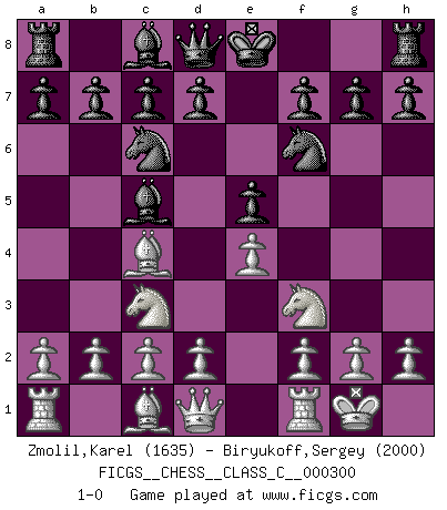 Last move : 1-0 2022 May 5 13:11:21 [Event "FICGS__CHESS__CLASS_C__000300"] [Site "FICGS"] [Date "2022.03.23"] [Round "1"] [White "Zmolil,Karel"] [Black "Biryukoff,Sergey"] [Result "1-0"] [WhiteElo "1635"] [BlackElo "2000"] 1.e4 e5 2.Nf3 Nc6 3.Bc4 Bc5 4.Nc3 Nf6 5.O-O 1-0 This chess game has been lost on time (started : 2022.03.23 9:34:51) Giuoco Piano : Four knights variation Kingside Castling by player White (move 5) Player White won this chess game. Follow this game move after move (download)At this time Fischer is simply a level above all the best Chessplayers in the world. (John Jacobs) Ich bin stolz ein Bulgare zu sein. (Veselin Topalov) La señal de un Gran Maestro es su habilidad de ganar una partida rápidamente y sin dolor. (Irving Chernev) L'ordinateur a tué l'originalité. Il n'y a plus guère d'aventures sur l'échiquier. (Jacob Murray) The weakness of an artist is dogma. (Josh Waitzkin)
