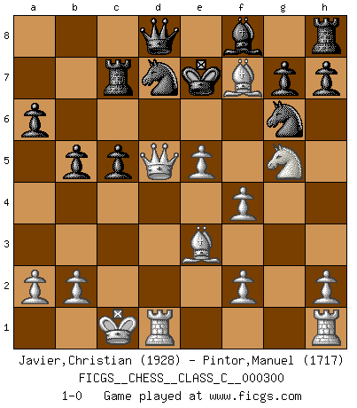 Last move : 1-0 2022 May 18 13:20:38 [Event "FICGS__CHESS__CLASS_C__000300"] [Site "FICGS"] [Date "2022.03.23"] [Round "1"] [White "Javier,Christian"] [Black "Pintor,Manuel"] [Result "1-0"] [WhiteElo "1928"] [BlackElo "1717"] 1.Nf3 Nc6 2.d4 d5 3.c4 Nf6 4.cxd5 Nxd5 5.e4 Nf6 6.Nc3 Bg4 7.d5 Bxf3 8.gxf3 Ne5 9.f4 Ng6 10.Qa4+ Nd7 11.Be3 a6 12.Bh3 b5 13.Qc2 e5 14.dxe6 fxe6 15.O-O-O Qf6 16.e5 Qf7 17.Ne4 c5 18.Ng5 Qe7 19.Qe4 Rc8 20.Bxe6 Rc7 21.Qa8+ Qd8 22.Bf7+ Ke7 23.Qd5 1-0 Reti Opening Queenside Castling by player White (move 15) Player White won this chess game. Follow this game move after move (download)Every Pawn is a potential Queen. (James Mason) Ein Schachspiel besteht aus drei Phasen: Die erste, wenn du hofftst den Vorteil zu haben, die zweite, wenn du glaubst einen Vorteil zu haben, und die dritte.... wenn du weißt Du wirst verlieren. (Savielly Grigorievitsch Tartakower) En el Ajedrez, tal como en la vida, las bendiciones de hoy pueden ser el veneno del mañana. (Assaic) Vouloir jouer aux échecs contre soi-même est aussi paradoxal que vouloir marcher sur son ombre. (Stefan Zweig) Just because you do not take an interest in politics doesn't mean politics won't take an interest in you. (Pericles 430 B.C.)