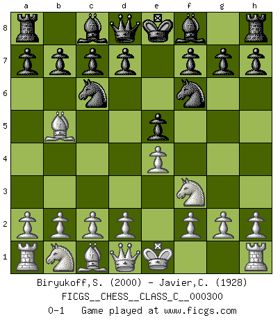 Last move : 0-1 2022 May 8 20:4:25 [Event "FICGS__CHESS__CLASS_C__000300"] [Site "FICGS"] [Date "2022.03.23"] [Round "1"] [White "Biryukoff,Sergey"] [Black "Javier,Christian"] [Result "0-1"] [WhiteElo "2000"] [BlackElo "1928"] 1.e4 e5 2.Nf3 Nc6 3.Bb5 Nf6 0-1 This chess game has been lost on time (started : 2022.03.23 9:34:51) Ruy Lopez : Berlin defense Player Black won this chess game. Follow this game move after move (download)Examine moves that smite! A good eye for smites is far more important than a knowledge of strategical principles. (Purdy) Schach ist ein Teil der Kultur, und wenn es mit der Kultur abwärts geht, geht es auch mit dem Schach abwärts. (Mikhail Moiseyevich Botvinik) El Ajedrez moderno está demasiado preocupado con cosas como la estructura de Peones. Olvidenlo, el Jaque Mate termina la partida. (Nigel Short) On entre au jeu d'Echecs comme on entre en Religion. Pour le joueur d'Echecs, la partie d'Echecs c'est l'office, la messe, le défilé du 1er Mai, le dépôt de gerbe au Monument aux Morts. C'est un drame sacré. (Michel Roos) See no evil, hear no evil, speak no evil. (The 3 monkeys)