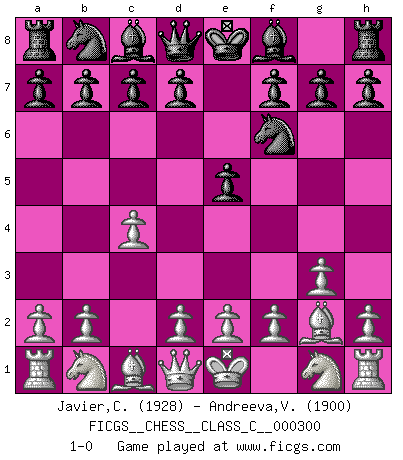 Last move : 1-0 2022 May 6 1:12:39 [Event "FICGS__CHESS__CLASS_C__000300"] [Site "FICGS"] [Date "2022.03.23"] [Round "1"] [White "Javier,Christian"] [Black "Andreeva,Veronika"] [Result "1-0"] [WhiteElo "1928"] [BlackElo "1900"] 1.g3 e5 2.c4 Nf6 3.Bg2 1-0 This chess game has been lost on time (started : 2022.03.23 9:34:51) Benko's Opening Player White won this chess game. Follow this game move after move (download)By this measure (on the gap between Fischer & his contemporaries), I consider him the greatest world champion. (Garry Kasparov) Wer mein Gambit spielt, muß bereit sein, alle Brücken hinter sich abzubrechen. Es verändert den ganzen Menschen. Es wirkt wie ein Zauberstab und fördert verkümmerte, gute Charakter- eigenschaften wieder zu Tage. (Emil Joseph Diemer) Yo considero que Fischer es uno de los expertos mas grandes de aperturas de siempre. (Keith Hayward) Toute estimation doit être constamment réévaluée. (Jacob Estrin) All the troubles of the world come from being unable to sit alone in a quiet room. (Blaise Pascal)