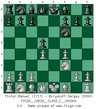 Last move : 1-0 2022 May 3 23:45:23 [Event "FICGS__CHESS__CLASS_C__000300"] [Site "FICGS"] [Date "2022.03.23"] [Round "1"] [White "Pintor,Manuel"] [Black "Biryukoff,Sergey"] [Result "1-0"] [WhiteElo "1717"] [BlackElo "2000"] 1.e4 e6 2.f4 d5 3.exd5 exd5 4.Nf3 Nf6 5.d4 1-0 This chess game has been lost on time (started : 2022.03.23 9:34:51) French : Labourdonnais variation Player White won this chess game. Follow this game move after move (download)The defensive power of a pinned piece is only imaginary. (Aaron Nimzovich) Der Schachmeister von Heute braucht Courage, einen Killerinstinkt, Ausdauer und Arroganz. (Larry Evans) Las ideas audaces son como las piezas del Ajedrez que avanzan hacia adelante. Ellas pueden ser vencidas, pero también pueden iniciar una partida victoriosa. (Goethe) Les Echecs ne sont pas pour les âmes timides. Ils requièrent un homme entier, qui ne s'arrête pas aveuglément à ce qui a été déjà établi, mais qui tente individuellement de sonder les profondeurs du jeu. (W. Steinitz) How many people work in NATO Headquarters ? - About half of them. (Dirk Stikker, NATO general secretary)