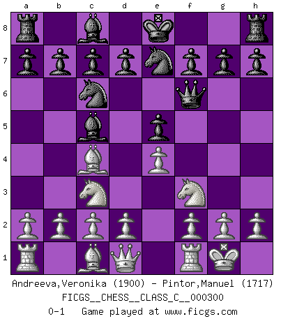 Last move : 0-1 2022 May 3 23:45:23 [Event "FICGS__CHESS__CLASS_C__000300"] [Site "FICGS"] [Date "2022.03.23"] [Round "1"] [White "Andreeva,Veronika"] [Black "Pintor,Manuel"] [Result "0-1"] [WhiteElo "1900"] [BlackElo "1717"] 1.e4 e5 2.Nf3 Nc6 3.Bc4 Qf6 4.O-O Bc5 5.Nc3 Nge7 0-1 This chess game has been lost on time (started : 2022.03.23 9:34:51) King's pawn game Kingside Castling by player White (move 4) Player Black won this chess game. Follow this game move after move (download)Of Chess it has been said that life is not long enough for it, but that is the fault of life, not Chess. (William Ewart Napier) Offener Brief an US-Präsident Bush anlässlich der Verhaftung Bobby Fishers: Verhaften Sie mich. Stecken Sie mich in dieselbe Zelle wie Bobby Fisher und geben Sie uns ein Schachspiel mit. (Boris Vassilievich Spassky) Morphy probablemente fue el genio más grande de todos. (Bobby Fischer) Votre prénom est 'Tactique', votre deuxième prénom est 'Tactique' et votre nom est 'Tactique'. (Ken Smith) I find your interest interesting. (Gregory House, House M.D.)