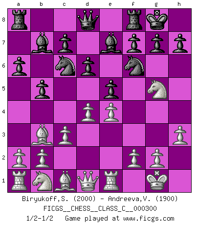 Last move : 1/2-1/2 2022 April 6 11:48:54 [Event "FICGS__CHESS__CLASS_C__000300"] [Site "FICGS"] [Date "2022.03.23"] [Round "1"] [White "Biryukoff,Sergey"] [Black "Andreeva,Veronika"] [Result "1/2-1/2"] [WhiteElo "2000"] [BlackElo "1900"] 1.e4 e5 2.Nf3 Nc6 3.Bb5 a6 4.Ba4 Nf6 5.O-O Be7 6.Re1 b5 7.Bb3 d6 8.c3 O-O 9.h3 Bb7 10.d4 Re8 11.Ng5 Rf8 1/2-1/2 Ruy Lopez : Closed Kingside Castling by player White (move 5) Kingside Castling by player Black (move 8) This chess game ended in a draw. Follow this game move after move (download)There's never before been a Chess player with such a thorough knowledge of the intricacies of the game and such an absolutely indomitable will to win. I think Bobby is the greatest player that ever lived. (Lisa Lane) Du weisst es gibt ein Problem mit Computern und Fernschach, wenn jeder eine Rating von 2450 hat. (John Christen Knudsen) Bobby solo arroja las piezas y solas caen en las casillas correctas. (Miguel Najdorf ) Si le désir cupide (et stupide) de gagner est une inépuisable source de souffrance, une combinaison brillante sur l'échiquier est une découverte : le coquelicot qui s'épanouit lorsque apparaît la Voie Lactée. (Arrabal) There is a very easy way to return from a casino with a small fortune : go there with a large one. (Jack Yelton)