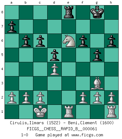 Last move : 1-0 2007 September 3 0:55:24 [Event "FICGS__CHESS__RAPID_B__000061"] [Site "FICGS"] [Date "2007.08.01"] [Round "1"] [White "Cirulis,Ilmars"] [Black "Beni,Clement"] [Result "1-0"] [WhiteElo "1522"] [BlackElo "1600"] 1.e4 e6 2.d4 d6 3.Nc3 Nf6 4.Nf3 b6 5.Bc4 Ba6 6.Bxa6 Nxa6 7.Qe2 Qd7 8.Qxa6 Be7 9.Bf4 O-O 10.O-O-O h6 11.e5 Qc8 12.Qxc8 Raxc8 13.exf6 Bxf6 14.Ne4 Bg5 15.Bxg5 d5 16.Nf6+ Kh8 17.Nd7 Rfe8 18.Bh4 c6 19.Nfe5 f6 20.Nf7+ Kg8 21.Nd6 Rcd8 22.Nxe8 Rxd7 23.Bg3 Rd8 24.Nc7 g5 25.Nxe6 Re8 26.Rde1 1-0 Lengfellner system Kingside Castling by player Black (move 9) Queenside Castling by player White (move 10) Player White won this chess game. Follow this game move after move (download)All my games are real. (Bobby Fischer) Die Leute spielen gegen mich seit 15 Jahren unter Ihren Möglichkeiten. (Robert James Fischer) Fischer es el jugador mas fuerte del mundo. De hecho, el jugador mas fuerte que jamas haya existido. (Larry Evans) Les échecs, c'est l'art d'analyser. (Mikhail Botvinnik) Life is like a ten-speed bicycle: most of us have gears we never use. (Charles M. Schulz)