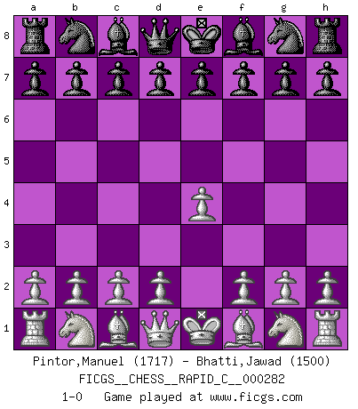 Last move : 1-0 2022 April 22 19:42:32 [Event "FICGS__CHESS__RAPID_C__000282"] [Site "FICGS"] [Date "2022.03.23"] [Round "1"] [White "Pintor,Manuel"] [Black "Bhatti,Jawad"] [Result "1-0"] [WhiteElo "1717"] [BlackElo "1500"] 1.e4 1-0 This chess game has been lost on time (started : 2022.03.23 9:35:48) King's pawn Opening Player White won this chess game. Follow this game move after move (download)It is the aim of the modern school, not to treat every position according to one general law, but according to the principle inherent in the position. (Richard Reti) Das Spiel gibt uns die Genugtuung, die das Leben uns versagt. (Emanuel Lasker) El Ajedrez es un terrible juego. Si no controlas el centro, tu oponente tiene una posición mas holgada. Si tienes control del centro, ¡entonces realmente tu tienes algo de que preocuparte!. (Siegbert Tarrasch) Un footballeur joue avec ses pieds, parfois avec sa tête. Un joueur d'échecs ne joue qu'avec sa tête. Et quand il ne joue plus, il meurt. (Jacob Murray) I can't decide which is riskier; taking crazy risks, or taking advice on crazy risks from a crazy risk taker. (Gregory House in House M.D.)
