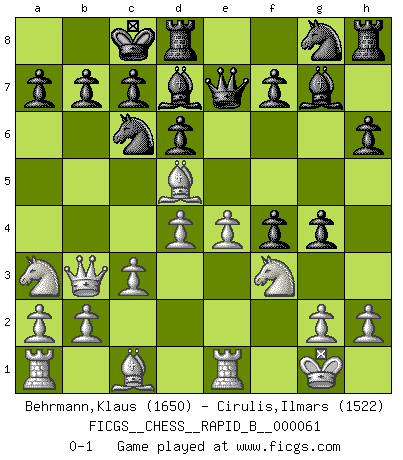 Last move : 0-1 2007 September 4 22:14:24 [Event "FICGS__CHESS__RAPID_B__000061"] [Site "FICGS"] [Date "2007.08.01"] [Round "1"] [White "Behrmann,Klaus"] [Black "Cirulis,Ilmars"] [Result "0-1"] [WhiteElo "1650"] [BlackElo "1522"] 1.e4 e5 2.f4 exf4 3.Nf3 d6 4.Bc4 Nc6 5.d4 g5 6.O-O Bg7 7.c3 Qe7 8.Na3 Bd7 9.Bd5 O-O-O 10.Qb3 h6 11.Re1 g4 0-1 KGA : Fischer defense Kingside Castling by player White (move 6) Queenside Castling by player Black (move 9) Player Black won this chess game. Follow this game move after move (download)One of these modest little moves may be more embarrassing to your opponent than the biggest threat. (Siegbert Tarrasch) Eine Person mit durchschnittlichem IQ kann etwa eine ELO von 2000 erreichen. (Jonathan Levitt) En un gambito tu regalas un Peón por el bién de tomar un juego perdido. (Samuel Standige Boden) À la honte des hommes, on sait que les lois du jeu sont les seules qui soient partout justes, claires, inviolables et exécutées. Pourquoi l'Indien qui a donné les règles du jeu d'échecs est-il obéi de bon gré dans toute la terre, et que les décrétales des papes, par exemple, sont aujourd'hui un objet d'horreur et de mépris ? C'est que l'inventeur des échecs combina tout avec justesse pour la satisfaction des joueurs, et que les papes, dans leurs décrétales, n'eurent en vue que leur seul avantage. L'Indien voulut exercer également l'esprit des hommes et leur donner du plaisir; les papes ont voulu abrutir l'esprit des hommes. Voltaire (Dictionnaire philosophique / Garnier 1967) The man who strikes first admits that his ideas have given out. (Chinese proverb)