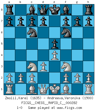 Last move : 1-0 2022 April 28 7:30:8 [Event "FICGS__CHESS__RAPID_C__000282"] [Site "FICGS"] [Date "2022.03.23"] [Round "1"] [White "Zmolil,Karel"] [Black "Andreeva,Veronika"] [Result "1-0"] [WhiteElo "1635"] [BlackElo "1900"] 1.e4 e5 2.Nf3 Nf6 3.Nc3 Nc6 4.d3 1-0 This chess game has been lost on time (started : 2022.03.23 9:35:48) Petrov Three knights game Player White won this chess game. Follow this game move after move (download)Daring ideas are like Chess men moved forward. They may be beaten, but they may start a winning game. (Johann Wolfgang von Goethe) Die Fehler sind da, Sie warten nur darauf gemacht zu werden. (Savielly Grigorievitsch Tartakower) El Ajedrez es sobre todo, ¡una pelea!. (Emanuel Lasker) Les Echecs ne sont pas pour les âmes timides. Ils requièrent un homme entier, qui ne s'arrête pas aveuglément à ce qui a été déjà établi, mais qui tente individuellement de sonder les profondeurs du jeu. (W. Steinitz) If you ain't just a little scared when you enter a casino, you are either very rich or you haven't studied the games enough. (Pappy)