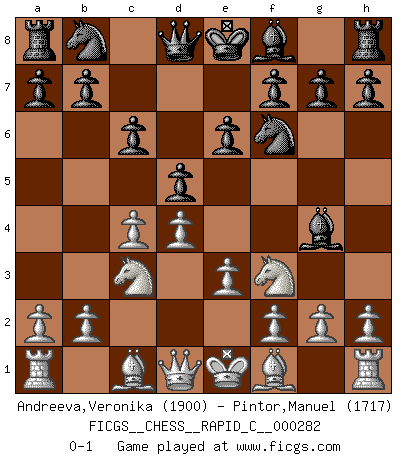 Last move : 0-1 2022 April 28 19:46:17 [Event "FICGS__CHESS__RAPID_C__000282"] [Site "FICGS"] [Date "2022.03.23"] [Round "1"] [White "Andreeva,Veronika"] [Black "Pintor,Manuel"] [Result "0-1"] [WhiteElo "1900"] [BlackElo "1717"] 1.d4 d5 2.c4 c6 3.Nf3 Nf6 4.Nc3 Bg4 5.e3 e6 0-1 This chess game has been lost on time (started : 2022.03.23 9:35:48) QGD Slav : 4.Nc3 Player Black won this chess game. Follow this game move after move (download)Chess is played with the mind and not with the hands ! (Renaud and Kahn) Es gibt nur zwei wahre Schachgenies - das andere war Wilhelm Steinitz, der Weltmeister von 1872 bis 1894. (Robert James Fischer) Bobby Fischer es el jugador de Ajedrez mas grande que jamás haya existido. (Ken Smith) Horreur, mais aussi harmonie suprême : qu'y avait-il en effet au monde en dehors des échecs ? Le brouillard, l'inconnu, le non-être... (Vladimir Nabokov) There is no vagueness without wind. (Chinese proverb)