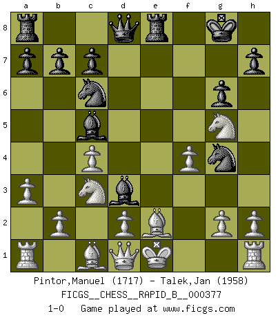 Last move : 1-0 2022 May 8 20:4:25 [Event "FICGS__CHESS__RAPID_B__000377"] [Site "FICGS"] [Date "2022.03.24"] [Round "1"] [White "Pintor,Manuel"] [Black "Talek,Jan"] [Result "1-0"] [WhiteElo "1717"] [BlackElo "1958"] 1.e4 g6 2.f4 d5 3.exd5 Nf6 4.c4 e6 5.dxe6 Nc6 6.exf7+ Kxf7 7.Nf3 Bc5 8.Nc3 Re8+ 9.Be2 Bf5 10.Na4 Bd3 11.Nc3 Ng4 12.Ng5+ Kg8 13.a3 1-0 This chess game has been lost on time (started : 2022.03.24 11:44:51) Robatsch (Modern) defense Player White won this chess game. Follow this game move after move (download)Those who say they understand Chess, understand nothing. (Robert Hubner) Ich bin stolz ein Bulgare zu sein. (Veselin Topalov) Vive, pierde y aprende al observar a tu oponente como gana. (Amber Steenbock) Roi des jeux et jeu des rois, les échecs portent en eux un sentiment d'infini. Ils donnent à celui qui s'est efforcé d'en approfondir les arcanes l'impression de n'être pas à la mesure de l'homme; en fait, ils constituent un résumé de l'univers, un microcosme, et figurent cette grande échelle qui, dans les plans de la lumière descend jusqu'à la matière, qui des abîmes insondables remonte jusqu'en l'infini de Dieu. (Pyrame) A good programmer is someone who always looks both ways before crossing a one-way street. (Doug Linder)