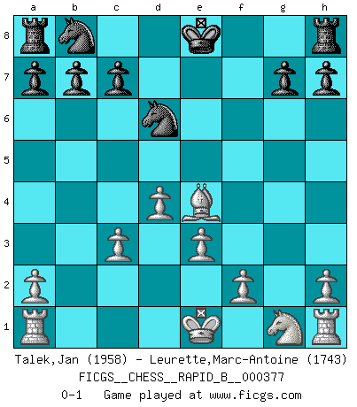 Last move : 0-1 2022 May 10 13:16:3 [Event "FICGS__CHESS__RAPID_B__000377"] [Site "FICGS"] [Date "2022.03.24"] [Round "1"] [White "Talek,Jan"] [Black "Leurette,Marc-Antoine"] [Result "0-1"] [WhiteElo "1958"] [BlackElo "1743"] 1.g4 e5 2.Bg2 d5 3.d4 e4 4.c4 Bb4+ 5.Bd2 Bxd2+ 6.Qxd2 Be6 7.cxd5 Bxd5 8.Nc3 Ne7 9.e3 Qd7 10.Nxd5 Qxd5 11.Qc2 Qa5+ 12.Qc3 Qxc3+ 13.bxc3 f5 14.gxf5 Nxf5 15.Bxe4 Nd6 0-1 This chess game has been lost on time (started : 2022.03.24 11:44:51) Grob's attack Player Black won this chess game. Follow this game move after move (download)The chessboard is the world, the pieces are the phenomena of the Universe, the rules of the game are what we call the laws of Nature and the player on the other side is hidden from us. (Thomas Huxley) Ich kenne keine einzige Person, die behaupten würde, Garri Kasparow sei ein guter Mensch (Nigel Short) Después de la respuesta de las negras a 1.e4 con 1..e5, se quedan siempre tratando de entrar dentro del juego. (Howard Staunton) Vous n'êtes pas toujours obligé de jouer le meilleur coup. Un coup doit être actif, entreprenant, correct et beau ! (David Bronstein) O divine art of subtlety and secrecy! Through you we learn to be invisible, through you inaudible and hence we can hold the enemy's fate in our hands. (Sun Tzu)