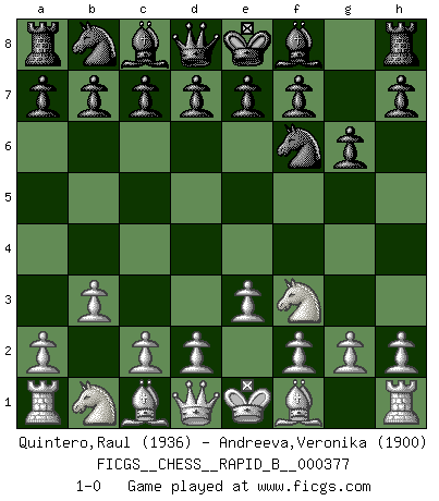 Last move : 1-0 2022 April 29 13:4:24 [Event "FICGS__CHESS__RAPID_B__000377"] [Site "FICGS"] [Date "2022.03.24"] [Round "1"] [White "Quintero,Raul"] [Black "Andreeva,Veronika"] [Result "1-0"] [WhiteElo "1936"] [BlackElo "1900"] 1.Nf3 Nf6 2.b3 g6 3.e3 1-0 This chess game has been lost on time (started : 2022.03.24 11:44:51) Reti Opening Player White won this chess game. Follow this game move after move (download)Half the variations which are calculated in a tournament game turn out to be completely superfluous. Unfortunately, no one knows in advance which half. (Jan Tinman) Über Karpov: Er war und ist ein Vertreter der russischen Reaktionäre. Das steckt tief in seiner Seele, wehalb ich nicht nett mit ihm umgehen kann. (Viktor Kortschnoi) ¿Porque tengo que perder ante este idiota?. (Aron Nimzovich) La vie et les Echecs sont tous les deux une lutte constante. (Lasker) The Internet is the first thing that humanity has build that humanity doesn't understand, the largest experiment in anarchy that we have ever had. (Eric Schmidt)