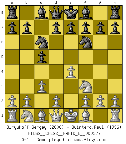 Last move : 0-1 2022 April 30 2:2:56 [Event "FICGS__CHESS__RAPID_B__000377"] [Site "FICGS"] [Date "2022.03.24"] [Round "1"] [White "Biryukoff,Sergey"] [Black "Quintero,Raul"] [Result "0-1"] [WhiteElo "2000"] [BlackElo "1936"] 1.e4 c5 2.c3 Nc6 3.Nf3 Nf6 0-1 This chess game has been lost on time (started : 2022.03.24 11:44:51) Sicilian : Alapin's variation (2.c3) Player Black won this chess game. Follow this game move after move (download)Chess is above all, a fight ! (Emanuel Lasker) Immer nach dem besten Zug zu suchen ist ziemlich unpraktisch. (Nigel Short) Coloca el contenido de las piezas del Ajedrez en un sombrero, agitalo vigorosamente, arrojalas en un tablero desde una altura de 30 centimetros y así obtendras el estilo de Steinitz. (H. E. Bird) Donnez-moi un Cavalier en 6e et je gagnerais toutes mes parties. (Steinitz) There are more things in heaven and earth than practically anywhere else. (Unknown)