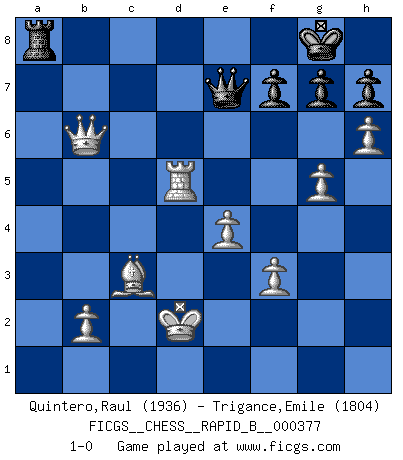 Last move : 1-0 2022 June 12 10:57:23 [Event "FICGS__CHESS__RAPID_B__000377"] [Site "FICGS"] [Date "2022.03.24"] [Round "1"] [White "Quintero,Raul"] [Black "Trigance,Emile"] [Result "1-0"] [WhiteElo "1936"] [BlackElo "1804"] 1.Nf3 d6 2.e4 c5 3.d4 cxd4 4.Nxd4 Nf6 5.Nc3 a6 6.f3 e5 7.Nb3 Be6 8.Be3 Be7 9.Qd2 O-O 10.O-O-O Nbd7 11.g4 Rc8 12.Kb1 b5 13.g5 Nh5 14.h4 Nb6 15.Qf2 Nc4 16.Bxc4 Bxc4 17.a3 d5 18.Nxd5 Bxd5 19.Nc1 Qc7 20.Rxd5 b4 21.axb4 Bxb4 22.Nd3 Bd6 23.Rd1 Rfd8 24.Nc5 Nf4 25.Nxa6 Qc6 26.Nb4 Qa4 27.Bxf4 Ra8 28.c3 Be7 29.Bxe5 Rxd5 30.Rxd5 Bxb4 31.cxb4 Qxb4 32.Kc2 Qa4+ 33.Kd2 Qc4 34.Qb6 Qc8 35.h5 Qe8 36.h6 Qe7 37.Bc3 1-0 Reti Opening Kingside Castling by player Black (move 9) Queenside Castling by player White (move 10) Player White won this chess game. Follow this game move after move (download)The boy (then a 12 year old boy named Anatoly Karpov) doesn't have a clue about Chess, and there's no future at all for him in this profession. (Mikhail Botvinnik) Ich würde mich als ganz normalen Jungen bezeichnen [Im Alter von 12]. (Sergej Karjakin) El pensamiento metódico es mas útil en el Ajedrez que la inspiración. (C. J. S. Purdy) Les Cavaliers se révèlent fort utiles dans les positions fermées. D'habitude, les Fous sont un peu plus forts que les Cavaliers dans les positions ouvertes. Qu'on le veuille ou non, il restera toujours des exceptions ! Wipe them out. All of them. (Darth Sidious in Star Wars ep.1)