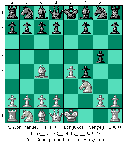 Last move : 1-0 2022 April 27 18:15:17 [Event "FICGS__CHESS__RAPID_B__000377"] [Site "FICGS"] [Date "2022.03.24"] [Round "1"] [White "Pintor,Manuel"] [Black "Biryukoff,Sergey"] [Result "1-0"] [WhiteElo "1717"] [BlackElo "2000"] 1.e4 e5 2.f4 exf4 3.Nf3 g5 4.Bc4 1-0 This chess game has been lost on time (started : 2022.03.24 11:44:51) KGA : King's knight's gambit Player White won this chess game. Follow this game move after move (download)Chess, like love, is infectious at any age. (Flohr) Sie bekommen vielleicht den Eindruck, dass die Spitzenspieler überhaupt gar nicht so stark sind. Aber das stimmt nicht. Es ist eine Illusion. Mit einem Computer an der Seite ist es sehr leicht, Urteile zu fällen, aber wenn man alleine am Brett sitzt, sieht die Sache ganz anders aus. (Vladimir Kramnik) El Ajedrez es el gimnasio de la mente. (Blaise Pascal) Les échecs sont plus proches de l'art de l'assassinat que de l'art de la guerre. (Arturo Perez-Reverte) Experiences are the keys to life. (Daniel Parmet)