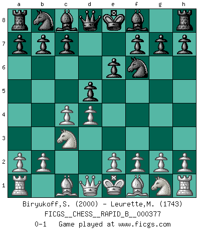 Last move : 0-1 2022 April 27 5:53:46 [Event "FICGS__CHESS__RAPID_B__000377"] [Site "FICGS"] [Date "2022.03.24"] [Round "1"] [White "Biryukoff,Sergey"] [Black "Leurette,Marc-Antoine"] [Result "0-1"] [WhiteElo "2000"] [BlackElo "1743"] 1.d4 d5 2.c4 e6 3.Nc3 Nf6 0-1 This chess game has been lost on time (started : 2022.03.24 11:44:51) QGD : 3...Nf6 Player Black won this chess game. Follow this game move after move (download)When you are lonely, when you feel yourself an alien in the world, play Chess. This will raise your spirits and be your counselor in war. (Aristotle) Oft bringt ein stiller Zug das Erdbeben. (Richard Reti) Entre mas años cumplo, mas valoro los Peones. (Keres) Je ne suis pas le dernier à jouer lâchement des coups douteux pendant le zeïtnot de l'adversaire pour l'achever: en effet les coups qui font le plus peur sont ceux que l'on ne comprend pas. Je me fais souvent peur quand je joue. (Un professeur anonyme) A shortcut is the longest distance between two points. (Don Groves)
