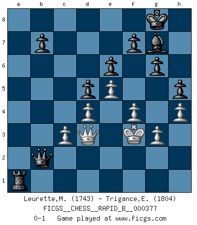 Last move : 0-1 2022 April 1 13:16:55 [Event "FICGS__CHESS__RAPID_B__000377"] [Site "FICGS"] [Date "2022.03.24"] [Round "1"] [White "Leurette,Marc-Antoine"] [Black "Trigance,Emile"] [Result "0-1"] [WhiteElo "1743"] [BlackElo "1804"] 1.e4 c5 2.Nc3 Nc6 3.g3 g6 4.Bg2 Bg7 5.d3 d6 6.Nge2 Nf6 7.O-O O-O 8.Nf4 e6 9.a3 Rb8 10.Rb1 Bd7 11.b4 cxb4 12.axb4 Ne8 13.Bd2 Nc7 14.Be3 Bxc3 15.b5 Nd4 16.Ne2 Nxe2+ 17.Qxe2 Nxb5 18.Rb3 Nd4 19.Bxd4 Bxd4 20.c3 Bg7 21.d4 Qc7 22.f4 a6 23.e5 Bb5 24.Rxb5 axb5 25.Qb2 d5 26.Rf3 Ra8 27.Bf1 Ra5 28.Bxb5 Qb6 29.Qe2 Rxb5 30.h4 Ra8 31.Qd3 Rb2 32.Rf2 Ra1+ 33.Kg2 Rxf2+ 34.Kxf2 Qb2+ 35.Kf3 h5 0-1 Sicilian : Closed Kingside Castling by player White (move 7) Kingside Castling by player Black (move 7) Player Black won this chess game. Follow this game move after move (download)Fischer was a master of clarity and a king of artful positioning. His opponents would see where he was going but were powerless to stop him. (Bruce Pandolfini) Frage des Reporters: -Worin besteht das Ziel von Gambiteröffnungen? Antwort: -Auf Kosten der Partie einen Ruf als Angriffspieler zu erwerben.- (Siegbert Tarrasch) Un Peón pasado aumenta su poder a medida de que el número de piezas en el tablero disminuye. (Capablanca) Le succès, c'est être capable d'aller d'échec en échec sans perdre son enthousiasme. (Winston Churchill) Good decisions come from experience, and experience comes from bad decisions. (Anonymous)