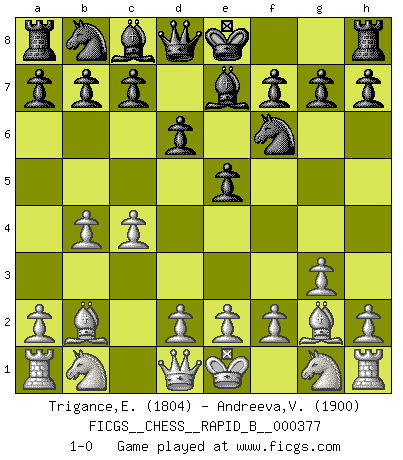 Last move : 1-0 2022 April 28 19:46:17 [Event "FICGS__CHESS__RAPID_B__000377"] [Site "FICGS"] [Date "2022.03.24"] [Round "1"] [White "Trigance,Emile"] [Black "Andreeva,Veronika"] [Result "1-0"] [WhiteElo "1804"] [BlackElo "1900"] 1.b4 d6 2.Bb2 Nf6 3.c4 e5 4.g3 Be7 5.Bg2 1-0 This chess game has been lost on time (started : 2022.03.24 11:44:51) Polish (Sokolsky) opening Player White won this chess game. Follow this game move after move (download)Could we look into the head of a Chess player, we should see there a whole world of feelings, images, ideas, emotion and passion. (Alfred Binet) Es ist besser die Steine des Gegners zu opfern. (Savielly Grigorievitsch Tartakower) Aún el Rey más flojo huye despavorido ante la amenaza de un Jaque doble. (Aaron Nimzowitsch) Fischer est le meilleur joueur du monde et Karpov n'est qu'un joueur de bistrot. (Garry Kasparov, agé de 16 ans) Real knowledge is to know the extent of one's ignorance. (Confucius)