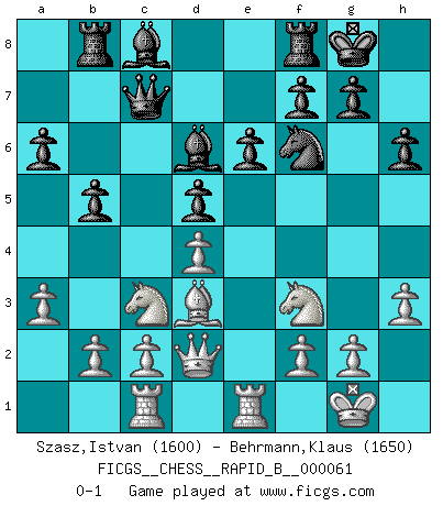 Last move : 0-1 2007 September 22 21:26:29 [Event "FICGS__CHESS__RAPID_B__000061"] [Site "FICGS"] [Date "2007.08.01"] [Round "1"] [White "Szasz,Istvan"] [Black "Behrmann,Klaus"] [Result "0-1"] [WhiteElo "1600"] [BlackElo "1650"] 1.e4 c6 2.d4 d5 3.exd5 cxd5 4.Nf3 Nf6 5.Bd3 e6 6.O-O Bd6 7.Bg5 Nbd7 8.Nc3 a6 9.Re1 Qc7 10.h3 O-O 11.Qd2 b5 12.a3 Rb8 13.Rac1 h6 14.Bxf6 Nxf6 0-1 This chess game has been lost on time (started : 2007.08.01 15:31:59) Caro-Kann : Exchange variation Kingside Castling by player White (move 6) Kingside Castling by player Black (move 10) Player Black won this chess game. Follow this game move after move (download)Chess is 99 percent tactics. (Teichmann) Dieses schreckliche Gefühl, dass ich gegen eine Maschine spielte, die niemals Fehler macht, zerschmetterte meinen Widerstand. (Mark Taimanov) El jugador blanco perdió porque fallo en recordar la coreccta continuación y tuvo que pensar por sí mismo las movidas. (Siegbert Tarrasch) Le jeu d'échecs fait naître et fortifie en nous plusieurs qualités précieuses dans le cours de l'existence, telles que la prévoyance, la circonspection, la prudence, et la persévérance. (Benjamin Franklin - 1783, la morale des échecs) Perhaps chess is the wrong game for the times (The Chess Master and the Computer, by Garry Kasparov - 2010)