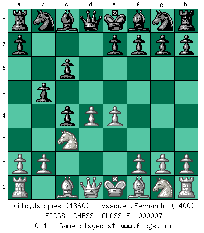 Last move : 0-1 2006 September 1 7:9:33 [Event "FICGS__CHESS__CLASS_E__000007"] [Site "FICGS"] [Date "2006.06.27"] [Round "1"] [White "Wild,Jacques"] [Black "Vasquez,Fernando"] [Result "0-1"] [WhiteElo "1360"] [BlackElo "1400"] 1.d4 d5 2.c4 dxc4 3.Nc3 c6 4.e4 b5 0-1 This chess game has been lost on time (started : 2006.06.27 19:4:46) Queen's gambit accepted Player Black won this chess game. Follow this game move after move (download)Nonsense was the last thing Fischer was interested in, as far as Chess was concerned. (Elie Agur) Alles was am Schachbrett zählt sind gute Züge. (Robert James Fischer) La única cosa que los jugadores de Ajedrez tienen en común, es el Ajedrez. (Lodewijk Prins) Vouloir jouer aux échecs contre soi-même est aussi paradoxal que vouloir marcher sur son ombre. (Stefan Zweig) Indecision is the key to flexibility. (Unknown)
