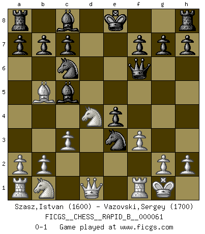 Last move : 0-1 2007 September 17 20:49:12 [Event "FICGS__CHESS__RAPID_B__000061"] [Site "FICGS"] [Date "2007.08.01"] [Round "1"] [White "Szasz,Istvan"] [Black "Vazovski,Sergey"] [Result "0-1"] [WhiteElo "1600"] [BlackElo "1700"] 1.e4 e5 2.Nf3 Nc6 3.d4 exd4 4.Nxd4 Bc5 5.Be3 Qf6 6.c3 Nge7 7.Be2 d5 8.f3 dxe4 9.O-O Nd5 10.Bb5 Nxe3 0-1 This chess game has been lost on time (started : 2007.08.01 15:31:59) Scotch game Kingside Castling by player White (move 9) Player Black won this chess game. Follow this game move after move (download)What would Chess be without silly mistakes ? (Kurt Richter) Ich würde die 30 stärksten Spieler der USA im Simultanspiel besiegen. (José Raúl Capablanca) En posiciones complicadas, Bobby Fischer pocas veces tuvo que temer de cualquiera. (Paul Keres) Le joueur d'Echecs qui veut atteindre le top est obligé de développer son propre credo créatif. Alexeï Stepanovicth Souétine. Il est facile d'écrire des livres ! Ce qui est difficile, c'est de jouer ! (Alexeï Stepanovicth Souétine) The meaning of life is that it is to be lived, and it is not to be traded and conceptualized and squeezed into a pattern of systems. (Bruce Lee)