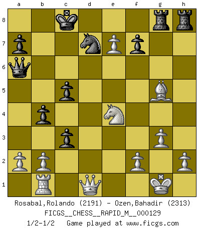 Last move : 1/2-1/2 2022 May 22 20:14:41 [Event "FICGS__CHESS__RAPID_M__000129"] [Site "FICGS"] [Date "2022.03.28"] [Round "1"] [White "Rosabal,Rolando"] [Black "Ozen,Bahadir"] [Result "1/2-1/2"] [WhiteElo "2191"] [BlackElo "2313"] 1.Nf3 d5 2.d4 Nf6 3.c4 e6 4.Nc3 c6 5.Bg5 dxc4 6.e4 b5 7.e5 h6 8.Bh4 g5 9.Nxg5 hxg5 10.Bxg5 Nbd7 11.g3 Bb7 12.Bg2 Qb6 13.exf6 O-O-O 14.O-O c5 15.d5 b4 16.Rb1 Qa6 17.dxe6 Bxg2 18.e7 Bxf1 19.Kxf1 Bxe7 20.fxe7 Rdg8 21.Ne4 c3 22.Kg1 1/2-1/2 Reti Opening Queenside Castling by player Black (move 13) Kingside Castling by player White (move 14) This chess game ended in a draw. Follow this game move after move (download)In a gambit you give up a Pawn for the sake of getting a lost game. (Samuel Standige Boden) Es macht mich traurig, wenn ich sehe, dass Golfprofis mehr verdienen als Schachsportler. Obwohl ich davon überzeugt bin, dass wir Schachspieler viel härter trainieren müssen als die Golfer. (Alexandra Kosteniuk) El Ajedrez es tan inspirador que yo no creo que un buen jugador sea capaz de tener un pensamiento malo durante una partida. (Wilhelm Steinitz) D'abord les bases : Jouez et étudiez, puis étudiez et jouez, ensuite jouez et étudiez, puis étudiez et jouez. Deuxièmement : Donnez toujours le meilleur de vous-même ! (Ken Smith) Computers are like Old Testament gods; lots of rules and no mercy. (Joseph Campbell)