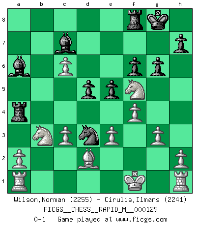 Last move : 0-1 2022 May 16 8:36:51 [Event "FICGS__CHESS__RAPID_M__000129"] [Site "FICGS"] [Date "2022.03.28"] [Round "1"] [White "Wilson,Norman"] [Black "Cirulis,Ilmars"] [Result "0-1"] [WhiteElo "2255"] [BlackElo "2241"] 1.d4 d5 2.e3 Nf6 3.Bd3 c5 4.dxc5 e6 5.b4 a5 6.c3 Nc6 7.Qb3 b6 8.Bb5 Qc7 9.cxb6 Qxb6 10.Bxc6+ Qxc6 11.b5 a4 12.Qxa4 Rxa4 13.bxc6 Ne4 14.Ne2 Nc5 15.Nd2 Nd3+ 16.Kf1 e5 17.Nb3 Bd6 18.f4 f6 19.Bd2 O-O 20.Ng3 Ba6 21.Nf5 Bc7 22.g3 g6 0-1 Queen's pawn : Stonewall attack Kingside Castling by player Black (move 19) Player Black won this chess game. Follow this game move after move (download)No price is too great for the scalp of the enemy King. (Koblentz) Zum Sieg gelangt man nicht, wenn man gut, sondern nur wenn man besser spielt (Savielly Grigorievitsch Tartakower) Las Aperturas te enseñan aperturas. ¡Los Finales te enseñan Ajedrez!. (Stephan Gerzadowicz) La vérité est comme le meilleur coup aux échecs : elle existe, mais il faut la chercher. (Arturo Perez-Reverte) Better than a thousand days of diligent study is one day with a great teacher. (Japanese proverb)