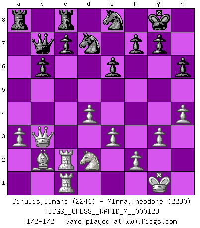Last move : 1/2-1/2 2022 May 4 3:6:45 [Event "FICGS__CHESS__RAPID_M__000129"] [Site "FICGS"] [Date "2022.03.28"] [Round "1"] [White "Cirulis,Ilmars"] [Black "Mirra,Theodore"] [Result "1/2-1/2"] [WhiteElo "2241"] [BlackElo "2230"] 1.d4 Nf6 2.c4 e6 3.g3 d5 4.Bg2 Bb4+ 5.Nd2 O-O 6.Ngf3 b6 7.O-O Bb7 8.b3 Re8 9.Bb2 a5 10.Rc1 a4 11.a3 Bxd2 12.Nxd2 axb3 13.Qxb3 Nbd7 14.e3 dxc4 15.Nxc4 Bxg2 16.Kxg2 Qb8 17.Rc2 Qb7+ 18.Kg1 Rec8 19.Rfc1 h6 20.Nd2 Ne8 21.h4 1/2-1/2 Catalan : Closed Kingside Castling by player Black (move 5) Kingside Castling by player White (move 7) This chess game ended in a draw. Follow this game move after move (download)All I want to do, ever, is just play Chess. (Bobby Fischer) Ein typischer, sehr verbreiteter Gedankenschädling ist der, daß der betreffende Amateur von der Annanhme ausgeht, daß jeder einzelne Zug etwas zu leisten habe. (Aaron Nimzowitsch) El hombre es un frívolo, una creatura engañosa y como un jugador de Ajedrez, se preocupa mas por el proceso de obtener su meta que de la meta por sí misma. (Dostoyevsky) J'ai vu le vaincu d'Echecs jouer des années durant dans l'espoir de la fête de la victoire. Car tu es plus riche de ce qu'elle existe si même elle n'est point pour toi. Ainsi de la perle du fond des mers. (Antoine de Saint-Exupéry) The question of whether computers can think is just like question of whether submarines can swim. (Edsger W. Dijkstra)