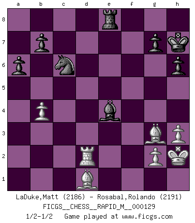 Last move : 1/2-1/2 2022 June 30 18:35:58 [Event "FICGS__CHESS__RAPID_M__000129"] [Site "FICGS"] [Date "2022.03.28"] [Round "1"] [White "LaDuke,Matt"] [Black "Rosabal,Rolando"] [Result "1/2-1/2"] [WhiteElo "2186"] [BlackElo "2191"] 1.e4 Nf6 2.e5 Nd5 3.d4 d6 4.c4 Nb6 5.f4 dxe5 6.fxe5 Nc6 7.Be3 Bf5 8.Nc3 e6 9.Be2 Be7 10.Nf3 O-O 11.O-O f6 12.exf6 Bxf6 13.Qd2 Qe7 14.Kh1 Rad8 15.Rad1 h6 16.h3 Bg6 17.Qc1 Rde8 18.Rfe1 Bh4 19.Nxh4 Qxh4 20.Kh2 e5 21.dxe5 Nxe5 22.c5 Nbd7 23.Rd4 Qe7 24.Nd5 Qxc5 25.Nxc7 Rc8 26.Qxc5 Nxc5 27.Nd5 Rce8 28.Rc1 Ne6 29.R4d1 a6 30.a4 Rf7 31.a5 Be4 32.Bh5 Bg6 33.Be2 Kh7 34.Bb6 Be4 35.Nc7 Nxc7 36.Rxc7 Rxc7 37.Bxc7 Nc6 38.Rd2 Re7 39.Bg3 Nxa5 40.b4 Nc6 41.Bd1 Re8 1/2-1/2 Alekhine's defense : Four pawns attack, 7.Be3 Kingside Castling by player Black (move 10) Kingside Castling by player White (move 11) This chess game ended in a draw. Follow this game move after move (download)We must make sure that Chess will not be like a dead language, very interesting, but for a very small group. (Sytze Faber) Vielleicht wirkt die Aura früherer Spieler glanzvoller als die der heutigen Spieler, aber das liegt daran, dass man kein Programm wie Fritz hatte, das einem all die Löcher in ihren Partien zeigt. (Vladimir Kramnik) Jugadores de primera clase pierden en contra de jugadores de segunda clase porque los jugadores de segunda clase a veces juegan una partida de primer clase. (Siegbert Tarrasch) Mais n'est-ce pas déjà le limiter injurieusement que d'appeler les échecs un jeu? N'est-ce pas aussi une science, un art, ou quelque chose qui, comme le cercueil de Mahomet entre ciel et terre, est suspendu entre l'un et l'autre, et qui réunit un nombre incroyable de contraires ? (Stefan Zweig) All politicians must be presumed guilty until they are proven innocent. (Dinesh De Silva)