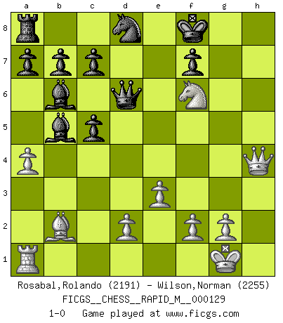 Last move : 1-0 2022 May 10 8:31:46 [Event "FICGS__CHESS__RAPID_M__000129"] [Site "FICGS"] [Date "2022.03.28"] [Round "1"] [White "Rosabal,Rolando"] [Black "Wilson,Norman"] [Result "1-0"] [WhiteElo "2191"] [BlackElo "2255"] 1.c4 e5 2.Nc3 Nf6 3.Nf3 Nc6 4.e3 Bb4 5.Qc2 d6 6.Ne2 Ba5 7.Ng3 Nb4 8.Qa4+ Nc6 9.a3 Bb6 10.b4 e4 11.Ng5 Qe7 12.b5 Nd8 13.h4 h6 14.Bb2 hxg5 15.hxg5 Rxh1 16.gxf6 Rxf1+ 17.Kxf1 gxf6 18.c5 dxc5 19.Nxe4 Kf8 20.Nxf6 Bd7 21.Qh4 Bxb5+ 22.Kg1 Qd6 23.a4 1-0 English Opening Player White won this chess game. Follow this game move after move (download)I have added these principles to the law: get the Knights into action before both Bishops are developed. (Emanuel Lasker) Als ich elf wurde, wurde ich einfach gut. (Robert James Fischer) No todos los artistas son jugadores de Ajedrez, pero todos los jugadores de Ajedrez son artistas. (Marcel Duchamp) Echiquier : carré parfait, comme la Jérusalem nouvelle décrite par l'auteur de l'Apocalypse, huit cases sur huit, exaltation du chiffre 4, symbole du cosmos aux quatre horizons... où le noir et le blanc, l'ombre et la lumière, le mal et le bien s'entremêlent et se conjuguent. (Robert Couffignal, Le Gambit du poète) If things go wrong, don't go with them. (Roger Babson)