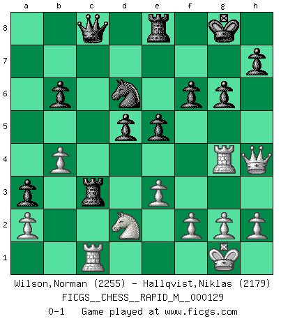 Last move : 0-1 2022 April 11 16:20:36 [Event "FICGS__CHESS__RAPID_M__000129"] [Site "FICGS"] [Date "2022.03.28"] [Round "1"] [White "Wilson,Norman"] [Black "Hallqvist,Niklas"] [Result "0-1"] [WhiteElo "2255"] [BlackElo "2179"] 1.d4 e6 2.c3 Nf6 3.Bf4 d5 4.e3 Bd6 5.Bxd6 Qxd6 6.Nf3 c5 7.Qa4+ Nc6 8.dxc5 Qxc5 9.Nbd2 O-O 10.Be2 Rd8 11.Qf4 Re8 12.Nb3 Qb6 13.Ne5 a5 14.Rb1 a4 15.Nc1 a3 16.Ncd3 Nxe5 17.Qxe5 Ne4 18.Bf3 Ra4 19.b4 Nd6 20.Rc1 Ra8 21.Nc5 Qd8 22.Be2 b6 23.Nb3 Ba6 24.Bxa6 Rxa6 25.O-O Nc4 26.Qh5 Ra7 27.Rfd1 Qa8 28.Rd4 e5 29.Rg4 Rc7 30.Qh6 g6 31.Rh4 f6 32.Rg4 Nd6 33.Nd2 Qc8 34.Qh4 Rxc3 0-1 Queen's pawn Kingside Castling by player Black (move 9) Kingside Castling by player White (move 25) Player Black won this chess game. Follow this game move after move (download)A good sacrifice is one that is not necessarily sound but leaves your opponent dazed and confused. (Rudolph Spielmann) Jeder Fehler erscheint unglaublich dumm, wenn andre ihn begehen. (Georg Christoph Lichtenberg) Un mal día en el Ajedrez, es mejor que cualquier buen día en el trabajo. (Anonymous) L'attaque fait le spectacle, la défense gagne les matchs. (Dicton footballistique) Nobody is always a winner, and anybody who says he is, is either a liar or doesn't play poker. (Amarillo Slim)