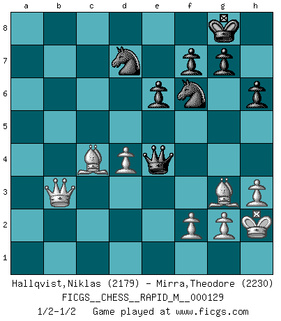 Last move : 1/2-1/2 2022 April 7 22:40:32 [Event "FICGS__CHESS__RAPID_M__000129"] [Site "FICGS"] [Date "2022.03.28"] [Round "1"] [White "Hallqvist,Niklas"] [Black "Mirra,Theodore"] [Result "1/2-1/2"] [WhiteElo "2179"] [BlackElo "2230"] 1.d4 Nf6 2.c4 e6 3.Nc3 Bb4 4.e3 O-O 5.Bd3 d5 6.Nf3 dxc4 7.Bxc4 c5 8.O-O cxd4 9.exd4 b6 10.Qe2 Bb7 11.Bg5 Nbd7 12.Rac1 Bxc3 13.bxc3 Qc7 14.Nd2 h6 15.Bh4 a6 16.Bd3 b5 17.Rfe1 Rfc8 18.h3 Qb6 19.Bg3 Qa5 20.c4 Qxa2 21.Ra1 Qb2 22.Qe3 Qb4 23.Reb1 Qf8 24.cxb5 axb5 25.Rxa8 Rxa8 26.Bxb5 Bd5 27.Nc4 Bxc4 28.Bxc4 Ra3 29.Rb3 Rxb3 30.Qxb3 Qa8 31.Kh2 Qe4 1/2-1/2 Theodore Mirra Thank you as well for an enjoyable game. Nimzo-Indian : 4.e3 O-O, 5.Bd3 d5 Kingside Castling by player Black (move 4) Kingside Castling by player White (move 8) This chess game ended in a draw. Follow this game move after move (download)Let the perfectionist play postal. (Yasser Seirawan) Der Freibauer hat für mich eine Seele, genau wie der Mensch, Wünsche, die unerkannt in ihm schlummern, und Befürchtungen, von deren Existenz er selbst kaum ahnt. (Aaron Nimzowitsch) Todos los jugadores de Ajedrez deberían tener un pasatiempo. (Savielly Tartakower) Avant la finale, les dieux ont créé le milieu de partie. (Tarrasch) Crush them ! Make them suffer ! (General Grievous in Star Wars ep.3)