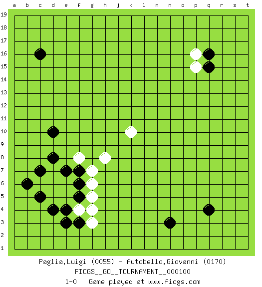 Last move : 1-0 2022 June 9 7:25:21 [Event "FICGS__GO__TOURNAMENT__000100"] [Site "FICGS"] [Date "2022.04.15"] [Round "1"] [Black "Paglia,Luigi"] [White "Autobello,Giovanni"] [Result "1-0"] [Rating 1 "0055"] [Rating 2 "0170"] 1.q16 k10 2.d4 p15 3.q4 d5 4.e4 e5 5.c16 f4 6.f3 g3 7.f5 g4 8.e3 g5 9.f6 g6 10.e7 e6 11.f7 g7 12.c5 d6 13.c7 d7 14.d8 c6 15.b6 h8 16.n3 f8 17.d10 p16 18.q15 1-0 Here are the names of the openings (joseki) played in the four corners : Corner q16 : q16 p15 Hoshi (Hwajeom, Seongjeom, Xingwei`) 4-4 Point. The star or hoshi (4-4) point, emphasizing influence at the potential expense of territory. Corner d4 : d4 d5 Hoshi (Hwajeom, Seongjeom, Xingwei`) 4-4 Point. The star or hoshi (4-4) point, emphasizing influence at the potential expense of territory. Player Black won this Go (weiqi, baduk) game. Follow this game move after move (download)On the third line, four die, six live. (Anonymous) I know the human being and fish can coexist peacefully. (George W. Bush, Saginaw sept. 29, 2000)