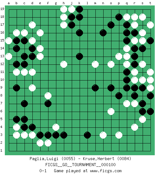 Last move : 0-1 2022 April 19 18:30:55 [Event "FICGS__GO__TOURNAMENT__000100"] [Site "FICGS"] [Date "2022.04.15"] [Round "1"] [Black "Paglia,Luigi"] [White "Kruse,Herbert"] [Result "0-1"] [Rating 1 "0055"] [Rating 2 "0084"] 1.q16 d17 2.c15 r4 3.d4 e16 4.d13 c16 5.k16 c11 6.c12 d11 7.c7 p3 8.l3 q14 9.r12 p13 10.n16 d9 11.b9 b11 12.b12 e13 13.d14 e14 14.q9 b16 15.b15 d15 16.b14 a15 17.c13 a13 18.r14 r7 19.r8 g4 20.h3 o12 21.o9 m12 22.k13 q12 23.r13 q7 24.m9 c3 25.c4 d3 26.e3 e2 27.f3 f2 28.g3 b4 29.b5 b3 30.c5 r17 31.q17 q18 32.p18 r18 33.o17 s15 34.r16 s16 35.s14 r15 36.q15 h17 37.j17 h18 38.j18 f8 39.f7 r10 40.q10 r11 41.q11 q13 42.r9 s12 43.s17 s18 44.t15 t17 45.s11 s10 46.s9 t11 47.t10 t9 48.t8 t10 49.s7 n3 50.s6 o6 51.p8 s5 52.t6 j19 53.k19 h19 54.k18 h12 0-1 Here are the names of the openings (joseki) played in the four corners : Corner d16 : d17 c15 Komoku (Somok, Xiao~mu`) 3-4 Point. The komoku (3-4) point is the traditional corner enclosure move.. Ikken Kakari (Hankan Keolch'im, Yi Gua`jiao~, 1-Space Low Pincer). The small knight move is the basic approach move to the 3-4 point stone. It has been continually used for over four centuries. There are limitless variations, with new moves constantly being discovered. Black 2 opens the door to a treaure store of joseki. Corner q16 : q16 q14 Hoshi (Hwajeom, Seongjeom, Xingwei`) 4-4 Point. The star or hoshi (4-4) point, emphasizing influence at the potential expense of territory. Ikken Takagakari (Hankan Nop'dakeolch'im, Yi Gaojia, 1-Space High Approach). Black typically responds at 6-4 or 3-10. Black 4-10 is played when Black finds play on the right side advantageous. Black 4-8 or 3-8 may be played when Black has support at top. Player White won this Go (weiqi, baduk) game. Follow this game move after move (download)Grab the border points between two moyos. (Anonymous) Perception is reality. (Immanuel Kant)