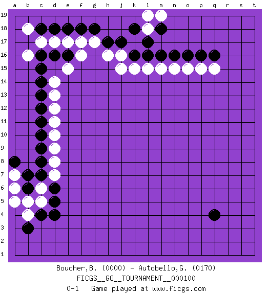Last move : 0-1 2022 September 22 6:10:47 [Event "FICGS__GO__TOURNAMENT__000100"] [Site "FICGS"] [Date "2022.04.15"] [Round "1"] [Black "Boucher,Brice"] [White "Autobello,Giovanni"] [Result "0-1"] [Rating 1 "0000"] [Rating 2 "0170"] 1.q16 p15 2.q4 q15 3.p16 o15 4.o16 n15 5.n16 m15 6.m16 l15 7.l16 k15 8.k16 j15 9.d4 j16 10.d16 k17 11.l17 l18 12.m18 m19 13.k18 l19 14.j17 h16 15.h17 g17 16.g18 f17 17.f18 e17 18.e18 d17 19.d18 c17 20.c18 b18 21.c16 b16 22.e16 f16 23.c15 e15 24.c14 d14 25.c13 d13 26.c12 d12 27.c11 d11 28.c10 d10 29.c9 d9 30.c8 d8 31.c7 d7 32.d6 c5 33.d5 c6 34.c4 b4 35.b6 b5 36.b3 a6 37.b7 a7 38.a8 a5 0-1 This go game has been lost on time (started : 2022.04.15 16:25:8) Here are the names of the openings (joseki) played in the four corners : Corner q16 : q16 p15 Hoshi (Hwajeom, Seongjeom, Xingwei`) 4-4 Point. The star or hoshi (4-4) point, emphasizing influence at the potential expense of territory. Player White won this Go (weiqi, baduk) game. Follow this game move after move (download)... {it is} something unearthly... if there are sentient beings on other planets, then they play go. (Emanuel Lasker, chess world champion) If you work for a living, why do you kill yourself working ? (Tuco to a chicken in The Good, The Bad and The Ugly)