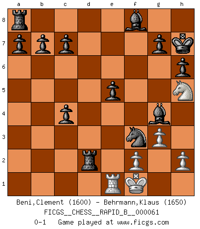 Last move : 0-1 2007 September 17 18:8:29 [Event "FICGS__CHESS__RAPID_B__000061"] [Site "FICGS"] [Date "2007.08.01"] [Round "1"] [White "Beni,Clement"] [Black "Behrmann,Klaus"] [Result "0-1"] [WhiteElo "1600"] [BlackElo "1650"] 1.d4 f5 2.c4 Nf6 3.Nc3 e6 4.g3 Bb4 5.Bd2 d5 6.Bg2 O-O 7.Nh3 dxc4 8.Bg5 h6 9.Bd2 Qxd4 10.a3 Be7 11.O-O Rd8 12.Nb5 Qd7 13.Rc1 Qxb5 14.a4 Qxb2 15.Rc2 Qb3 16.Nf4 Qxa4 17.Ng6 Bd6 18.e4 Nxe4 19.Bxe4 fxe4 20.Re1 Kh7 21.Nf4 e5 22.Nh5 Nc6 23.Rxe4 Nd4 24.Rg4 Bf8 25.Re4 Qxc2 26.Re1 Qxd1 27.Rxd1 Bg4 28.Re1 Nf3+ 29.Kf1 Rxd2 0-1 Dutch with c4 & Nc3 Kingside Castling by player Black (move 6) Kingside Castling by player White (move 11) Player Black won this chess game. Follow this game move after move (download)A chess genius has died; a loss for humanity. (Viktor Kortchnoi, about Bobby Fischer's death) Ich war zu klein für die Schach-Schülermannschaft! (Woody Allen) No soy una persona materialista y por eso, no resiento la falta o pérdida del dinero. La ausencia de cosas mundanas carece de importancia. Ya que el Ajedrez es una forma en la que puedo ser tan materialista como yo desee sin tener la necesidad de vender mi alma. (Jamie Walter Adams) La guerre est enfant de la passion, la passion est enfant du narcissisme et le narcissisme est l'enfant. (...) Une autre partie ? (Thibault de Vassal) It's not enough to succeed. Others must fail. (Gore Vidal)