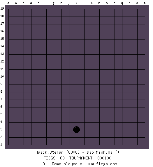 Last move : 1-0 2022 May 21 1:33:40 [Event "FICGS__GO__TOURNAMENT__000100"] [Site "FICGS"] [Date "2022.04.15"] [Round "1"] [Black "Haack,Stefan"] [White "Dao Minh,Ha"] [Result "1-0"] [Rating 1 "0000"] 1.k3 1-0 This go game has been lost on time (started : 2022.04.15 16:25:8) Here are the names of the openings (joseki) played in the four corners : Player Black won this Go (weiqi, baduk) game. Follow this game move after move (download)Good moves and bad moves are bedfellows. (Anonymous) Somehow our devils are never quite what we expect when we meet them face to face. (Nelson DeMille)