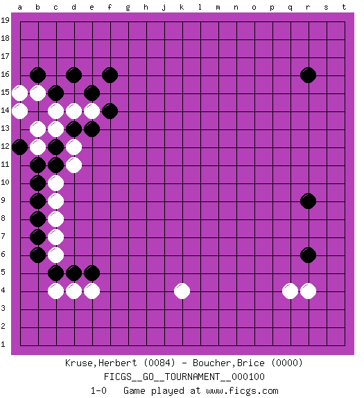 Last move : 1-0 2022 May 29 13:24:22 [Event "FICGS__GO__TOURNAMENT__000100"] [Site "FICGS"] [Date "2022.04.15"] [Round "1"] [Black "Kruse,Herbert"] [White "Boucher,Brice"] [Result "1-0"] [Rating 1 "0084"] [Rating 2 "0000"] 1.d16 q4 2.r16 d4 3.r6 r4 4.r9 d14 5.f16 k4 6.c15 c14 7.c12 d11 8.e13 d12 9.c11 c10 10.b10 c9 11.b9 c8 12.b8 c7 13.b7 c6 14.d13 e14 15.f14 c13 16.b6 b12 17.b11 b13 18.c5 b15 19.d5 c4 20.e5 e4 21.b16 a15 22.e15 a14 23.a12 1-0 Here are the names of the openings (joseki) played in the four corners : Corner q4 : q4 r6 Hoshi (Hwajeom, Seongjeom, Xingwei`) 4-4 Point. The star or hoshi (4-4) point, emphasizing influence at the potential expense of territory. Ikken Kakari (Hankan Keolch'im, Yi Gua`jiao~, 1-Space Low Approach). Black 2 is the standard approach move to the 4-4. Corner d16 : d16 d14 Hoshi (Hwajeom, Seongjeom, Xingwei`) 4-4 Point. The star or hoshi (4-4) point, emphasizing influence at the potential expense of territory. Ikken Takagakari (Hankan Nop'dakeolch'im, Yi Gaojia, 1-Space High Approach). Black typically responds at 6-4 or 3-10. Black 4-10 is played when Black finds play on the right side advantageous. Black 4-8 or 3-8 may be played when Black has support at top. Player Black won this Go (weiqi, baduk) game. Follow this game move after move (download)Learning josekis by heart is useless if you don't try departing from them. (Pierre Audouard) I find television to be very educating. Every time somebody turns on the set, I go in the other room and read a book. (Groucho Marx)