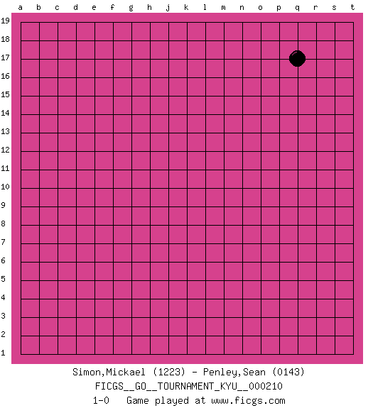 Last move : 1-0 2022 June 5 1:0:7 [Event "FICGS__GO__TOURNAMENT_KYU__000210"] [Site "FICGS"] [Date "2022.04.18"] [Round "1"] [Black "Simon,Mickael"] [White "Penley,Sean"] [Result "1-0"] [Rating 1 "1223"] [Rating 2 "0143"] 1.q17 1-0 This go game has been lost on time (started : 2022.04.18 8:14:27) Here are the names of the openings (joseki) played in the four corners : Player Black won this Go (weiqi, baduk) game. Follow this game move after move (download)Play slow, win slow; play fast, lose fast. (Anonymous) Memory is a way of holding onto the things you love, the things you are, the things you never want to lose. (from the television show: The Wonder Years)