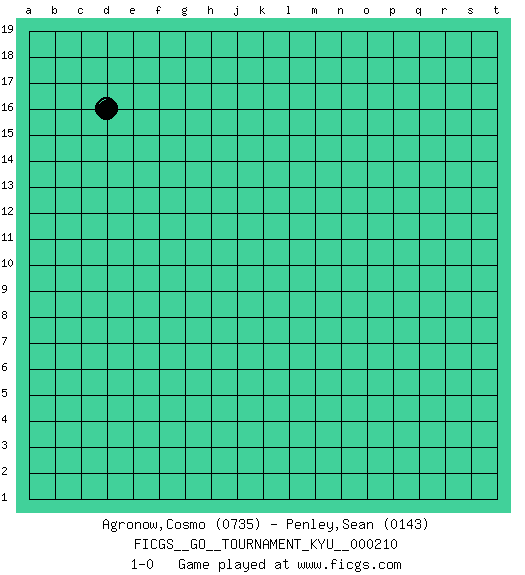 Last move : 1-0 2022 May 18 15:42:28 [Event "FICGS__GO__TOURNAMENT_KYU__000210"] [Site "FICGS"] [Date "2022.04.18"] [Round "1"] [Black "Agronow,Cosmo"] [White "Penley,Sean"] [Result "1-0"] [Rating 1 "0735"] [Rating 2 "0143"] 1.d16 1-0 This go game has been lost on time (started : 2022.04.18 8:14:27) Here are the names of the openings (joseki) played in the four corners : Player Black won this Go (weiqi, baduk) game. Follow this game move after move (download)When your opponent is thick, you must also become thick. (Otake Hideo, 9p) The real voyage of discovery consists not in seeking new lands but in seeing with new eyes. (Marcel Proust)