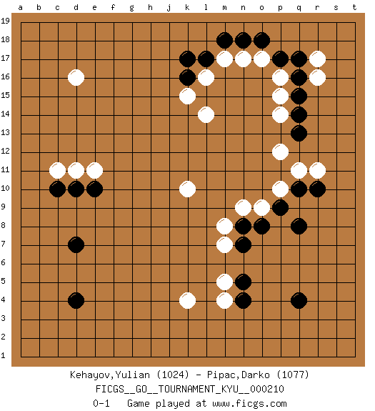 Last move : 0-1 2022 July 20 15:1:10 [Event "FICGS__GO__TOURNAMENT_KYU__000210"] [Site "FICGS"] [Date "2022.04.18"] [Round "1"] [Black "Kehayov,Yulian"] [White "Pipac,Darko"] [Result "0-1"] [Rating 1 "1024"] [Rating 2 "1077"] 1.d4 r17 2.q4 d16 3.q10 k10 4.d10 e11 5.e10 d11 6.c10 c11 7.d7 q11 8.r10 r11 9.k16 k4 10.q16 p16 11.q17 r16 12.q15 p15 13.q14 p14 14.q13 p12 15.p17 o17 16.o18 n17 17.n18 l16 18.l17 m17 19.m18 k15 20.k17 l14 21.q8 p10 22.p9 o9 23.o8 n9 24.n8 m8 25.n7 m7 26.n5 m5 27.n4 m4 0-1 This go game has been lost on time (started : 2022.04.18 8:14:27) Here are the names of the openings (joseki) played in the four corners : Player White won this Go (weiqi, baduk) game. Follow this game move after move (download)There are players who don't accept exchange: they play many moves that perpetuate a previous state of the game. (Pierre Audouard) If you don't practice you don't deserve to win. (Andre Agassi)