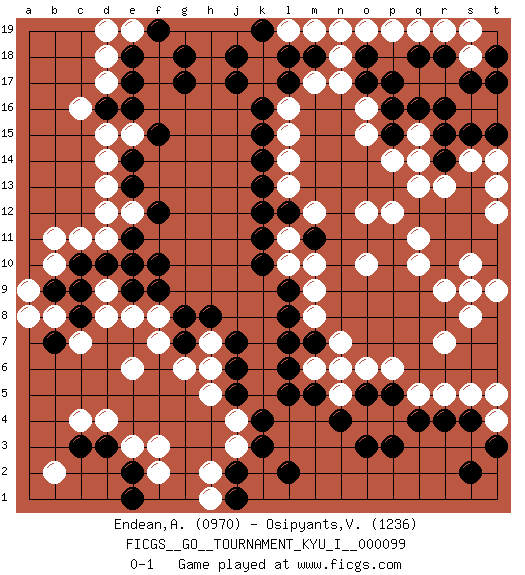 Last move : 0-1 2022 June 14 20:12:35 [Event "FICGS__GO__TOURNAMENT_KYU_I__000099"] [Site "FICGS"] [Date "2022.04.18"] [Round "1"] [Black "Endean,Andrew"] [White "Osipyants,Vladimir"] [Result "0-1"] [Rating 1 "0970"] [Rating 2 "1236"] 1.q4 d4 2.q16 c16 3.e16 d14 4.g17 q10 5.k4 f3 6.d10 c11 7.c10 c7 8.e14 d13 9.e13 d11 10.e11 e12 11.f12 d12 12.f10 e15 13.f15 d15 14.e17 l16 15.k16 l15 16.k15 o16 17.r14 p14 18.q12 r7 19.o3 r5 20.r4 j3 21.k3 j4 22.j5 h5 23.j6 h6 24.j7 o6 25.p5 p6 26.o5 q5 27.p3 m6 28.l5 n5 29.n4 o10 30.o17 n17 31.p17 n18 32.l17 l13 33.k14 l14 34.k13 o12 35.p15 o15 36.p16 q13 37.r12 r13 38.s13 q14 39.r15 p12 40.l12 h7 41.h8 f7 42.g8 f8 43.f9 d8 44.e9 e8 45.g7 g6 46.m5 n6 47.l6 m8 48.l7 l10 49.m11 m10 50.k10 l11 51.k11 m12 52.k12 d17 53.d16 d18 54.e18 e19 55.f19 d19 56.g18 s5 57.s4 t4 58.t3 t5 59.s2 q19 60.q18 p19 61.r18 r19 62.o18 o19 63.c3 c4 64.d3 e3 65.e2 f2 66.e1 b2 67.r10 r9 68.s9 s10 69.r11 s8 70.s11 t9 71.t11 m17 72.l18 s18 73.s17 b10 74.b9 b11 75.l9 m9 76.l8 b8 77.c9 a9 78.c8 e6 79.b7 a8 80.j2 h2 81.j1 h1 82.l2 d9 83.e10 q11 84.t10 s9 85.m7 n7 86.m18 t12 87.s12 s14 88.s15 t13 89.t15 t14 90.t17 s19 91.t18 m19 92.j17 l19 93.k19 n19 94.j18 q15 95.r16 pass 96.pass pass 0-1 Here are the names of the openings (joseki) played in the four corners : Corner d16 : c16 e16 Komoku (Somok, Xiao~mu`) 3-4 Point. The komoku (3-4) point is the traditional corner enclosure move.. Ikken Takagakari (Hankan Nop'dakeolch'im, Yi Gaogua`jiao~, 1-Space High Approach). The 5-4 approach move has become more popular in modern times, as modern Go emphasizes speed and influence. Corner q16 : q16 l16 Hoshi (Hwajeom, Seongjeom, Xingwei`) 4-4 Point. The star or hoshi (4-4) point, emphasizing influence at the potential expense of territory. Corner q4 : q4 r7 Hoshi (Hwajeom, Seongjeom, Xingwei`) 4-4 Point. The star or hoshi (4-4) point, emphasizing influence at the potential expense of territory. Niken Kakari (Dukan Keolch'im, E`r Gua`jiao~, 2-Space Low Approach). Black typically answers by 7-3 or 3-5 (which is not joseki). Player White won this Go (weiqi, baduk) game. Follow this game move after move (download)Strike at the waist of the knight's move. (Anonymous) Luck has a peculiar habit of favoring those who don't depend on it. (Author unknown)