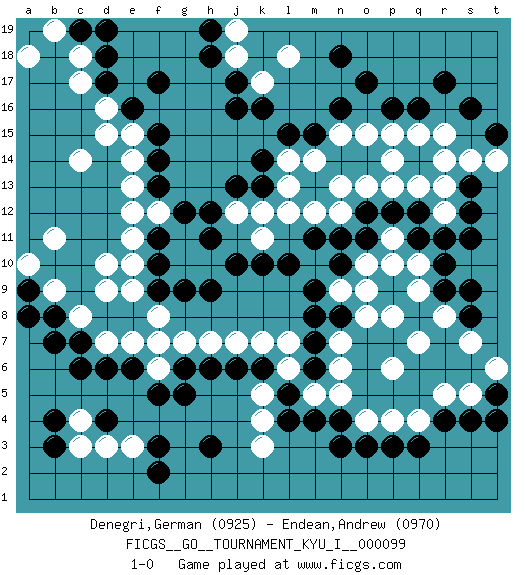 Last move : 1-0 2022 October 31 22:37:55 [Event "FICGS__GO__TOURNAMENT_KYU_I__000099"] [Site "FICGS"] [Date "2022.04.18"] [Round "1"] [Black "Denegri,German"] [White "Endean,Andrew"] [Result "1-0"] [Rating 1 "0925"] [Rating 2 "0970"] 1.q16 d16 2.r4 p4 3.d4 d10 4.p3 q4 5.q3 r5 6.s4 s5 7.o3 o4 8.f17 c14 9.j16 q10 10.o17 r14 11.n4 n5 12.m4 m5 13.l5 l6 14.m6 n6 15.m7 n7 16.k6 l7 17.m8 k5 18.l4 k7 19.j6 j7 20.h6 h7 21.g6 g7 22.q12 r12 23.r11 q13 24.q11 p13 25.r10 q9 26.o11 o13 27.o12 n13 28.n8 o8 29.n10 p8 30.s8 r8 31.s9 s7 32.c6 d7 33.d6 e7 34.b8 c8 35.b7 b9 36.d17 c17 37.d18 c18 38.e16 d15 39.f14 e14 40.f13 e13 41.f11 e11 42.m15 l14 43.l15 m14 44.s12 r13 45.r17 m12 46.l10 l12 47.s13 s14 48.j10 f12 49.g12 e12 50.h11 j12 51.k13 k12 52.k14 n15 53.n16 o15 54.e6 f6 55.f5 f7 56.g5 p15 57.p16 q15 58.c7 d9 59.j13 e3 60.f3 d3 61.f2 c4 62.b3 c3 63.b4 n9 64.m9 o9 65.a9 a10 66.a8 b11 67.r9 q7 68.c19 b19 69.d19 a18 70.s16 r15 71.f10 e10 72.g9 f8 73.f9 e9 74.t5 t6 75.t4 e15 76.f15 k17 77.j17 j18 78.h18 j19 79.h19 l18 80.n18 k3 81.h3 k4 82.n3 p6 83.h12 l13 84.h9 o10 85.m11 k11 86.k10 n12 87.n11 p11 88.p12 p14 89.k16 p10 90.t15 t14 91.s11 1-0 Here are the names of the openings (joseki) played in the four corners : Corner q4 : r4 p4 Komoku (Somok, Xiao~mu`) 3-4 Point. The komoku (3-4) point is the traditional corner enclosure move.. Ikken Takagakari (Hankan Nop'dakeolch'im, Yi Gaogua`jiao~, 1-Space High Approach). The 5-4 approach move has become more popular in modern times, as modern Go emphasizes speed and influence. Corner d16 : d16 f17 Hoshi (Hwajeom, Seongjeom, Xingwei`) 4-4 Point. The star or hoshi (4-4) point, emphasizing influence at the potential expense of territory. Ikken Kakari (Hankan Keolch'im, Yi Gua`jiao~, 1-Space Low Approach). Black 2 is the standard approach move to the 4-4. Player Black won this Go (weiqi, baduk) game. Follow this game move after move (download)Everything would seem to be possible in Go. Like pulling a rabbit, by a magical move, out of a hat. (Pierre Audouard) The existence of forgetting has never been proved: We only know that some things don't come to mind when we want them. (Friedrich Nietzsche)