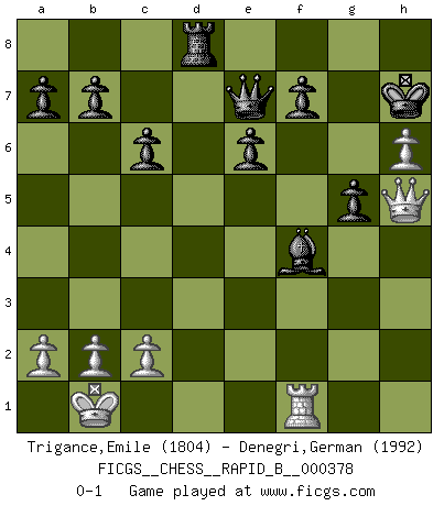 Last move : 0-1 2022 August 23 14:29:4 [Event "FICGS__CHESS__RAPID_B__000378"] [Site "FICGS"] [Date "2022.04.18"] [Round "1"] [White "Trigance,Emile"] [Black "Denegri,German"] [Result "0-1"] [WhiteElo "1804"] [BlackElo "1992"] 1.e4 c6 2.d4 d5 3.Nc3 dxe4 4.Nxe4 Bf5 5.Ng3 Bg6 6.h4 h6 7.f4 e6 8.Nf3 Bd6 9.h5 Bh7 10.Bd3 Bxd3 11.Qxd3 Ne7 12.Bd2 Nd7 13.O-O-O Qc7 14.Ne5 O-O 15.Ne4 Rfd8 16.g4 Nxe5 17.fxe5 Bxe5 18.Qf3 Bxd4 19.Bxh6 gxh6 20.Nf6+ Kg7 21.Rdf1 Nd5 22.g5 hxg5 23.h6+ Kh8 24.Rd1 Bxf6 25.Rxd5 Qe7 26.Rxd8+ Rxd8 27.Rf1 Be5 28.Qh5 Bf4+ 29.Kb1 Kh7 0-1 Caro-Kann : Classical, 6.h4 Queenside Castling by player White (move 13) Kingside Castling by player Black (move 14) Player Black won this chess game. Follow this game move after move (download)Do you realize Fischer almost never has any bad pieces? He exchanges them, and the bad pieces remain with his opponents. (Yuri Balashov) Die Elozahlen sind sehr schlecht für das Schach. Jetzt ist Schach eine Sportindustrie, die darauf zielt Elopunkte zu machen. (Miguel Najdorf) El Ajedrez es el juego mas altamente simbólico, pero las agresiones estan por lo tanto aún mas francamente representadas en la partida. Tal vez comenzo como un juego de guerra; Algo como la representación de una batalla en miniatura entre las fuerzas de dos reinos. (Karl Meninger) Vous savez, camarade Pachman, je n'éprouve pas de plaisir à être ministre, je jouerais plutôt aux échecs comme vous, ou alors ferais une révolution au Venezuela. (Che Guevara à Ludek Pachman, 'Checkmate in Prague', 1975) Art is the triumph over chaos. (John Cheever)