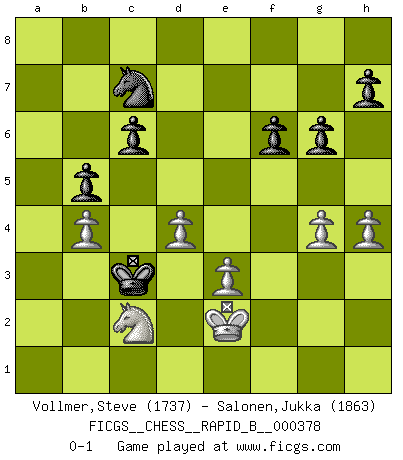 Last move : 0-1 2022 June 4 11:58:58 [Event "FICGS__CHESS__RAPID_B__000378"] [Site "FICGS"] [Date "2022.04.18"] [Round "1"] [White "Vollmer,Steve"] [Black "Salonen,Jukka"] [Result "0-1"] [WhiteElo "1737"] [BlackElo "1863"] 1.d4 d5 2.c4 e6 3.Nc3 Nf6 4.Nf3 c6 5.cxd5 exd5 6.Bg5 Nbd7 7.e3 Be7 8.Bd3 O-O 9.O-O Re8 10.Qc2 g6 11.a3 Ne4 12.Bxe7 Qxe7 13.b4 Ndf6 14.Ne5 Nd6 15.Rfc1 Bf5 16.Na4 Bxd3 17.Qxd3 Nd7 18.Nxd7 Qxd7 19.h3 Kg7 20.Nc5 Qe7 21.Qe2 a5 22.Qf3 Ra7 23.Nb3 axb4 24.axb4 Rea8 25.Rxa7 Rxa7 26.Ra1 Rxa1+ 27.Nxa1 Nb5 28.Nc2 Nc3 29.g4 f6 30.Qg2 Qe4 31.Qxe4 dxe4 32.Na3 b5 33.Kg2 Kf7 34.f3 Ke6 35.fxe4 Nxe4 36.Kf3 Ng5+ 37.Kg3 Kd5 38.h4 Ne6 39.Kf3 Nc7 40.Nc2 Kc4 41.Ke2 Kc3 0-1 QGD Semi-Slav Kingside Castling by player Black (move 8) Kingside Castling by player White (move 9) Player Black won this chess game. Follow this game move after move (download)He who fears an isolated Queen's Pawn should give up Chess. (Siegbert Tarrasch) Es tut gut, die Entwicklungsperiode von, [...] demokratischem Geist durchdringen zu lassen. Wie undemokratisch wäre es doch beispielsweise, den einen Offizier große Spaziertouren vornehmen zu lassen, während die anderen zu Hause säßen und sich entsetzlich langweilten. (Aaron Nimzowitsch) La vida es como el Ajedrez, con lucha, competición y eventos buenos y malos. (Benjamin Franklin) Vous m'avez demandé de vous exposer quel est le fondement de la prière. Je ne fais que préparer les pièces du jeu sur la table... Nous sera-t-il permis d'en adopter les règles et si nous les appliquons scrupuleusement nous ne tarderons pas à faire mat le Roi divin ! Il ne pourra échapper à nos mains. (Sainte Thérèse d'Avila, Chemin de perfection) Children in the dark cause accidents, accidents in the dark cause children. (Unknown)