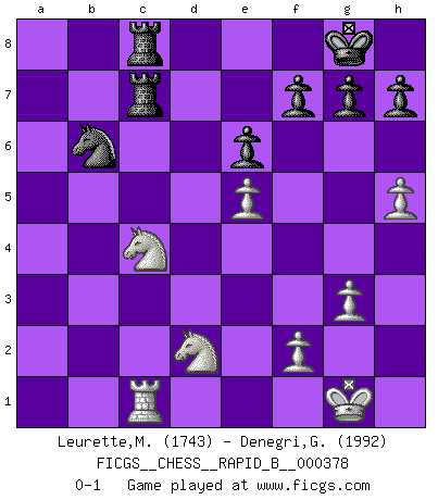 Last move : 0-1 2022 June 15 7:43:50 [Event "FICGS__CHESS__RAPID_B__000378"] [Site "FICGS"] [Date "2022.04.18"] [Round "1"] [White "Leurette,Marc-Antoine"] [Black "Denegri,German"] [Result "0-1"] [WhiteElo "1743"] [BlackElo "1992"] 1.e4 e6 2.d4 d5 3.e5 c5 4.Bb5+ Bd7 5.Bxd7+ Nxd7 6.Nf3 cxd4 7.Qxd4 Bc5 8.Qd3 Qc7 9.O-O Ne7 10.b3 Ng6 11.Bb2 O-O 12.Re1 Rac8 13.Nbd2 Bb4 14.Rac1 Bc3 15.Bxc3 Qxc3 16.Qxc3 Rxc3 17.Nb1 Rc7 18.a4 Rfc8 19.c3 Nc5 20.Nbd2 Nd3 21.c4 Nxc1 22.Rxc1 a6 23.g3 b5 24.axb5 axb5 25.h4 bxc4 26.bxc4 dxc4 27.h5 Ne7 28.Ne4 Nd5 29.Nd6 Ra8 30.Nxc4 Rac8 31.Nfd2 Nb6 0-1 French : Advance variation Kingside Castling by player White (move 9) Kingside Castling by player Black (move 11) Player Black won this chess game. Follow this game move after move (download)Castle early and often. (Rob Sillars) Garry Kasparov war erst in der Großmeister-Organisation GMA, dann in der Profischach-Vereinigung PCA, zum Schluss kehrte er wieder in den Schoß der FIDE zurück. Aber gut, manche Leute sind flexibel (Viswanathan Anand) Las ideas audaces son como las piezas del Ajedrez que avanzan hacia adelante. Ellas pueden ser vencidas, pero también pueden iniciar una partida victoriosa. (Goethe) Les Echecs sont affaire de jugement sensible. Savoir quand frapper et quand esquiver. (Fischer) There are two types of people in this world, good and bad. The good sleep better, but the bad seem to enjoy the waking hours much more. (Woody Allen)