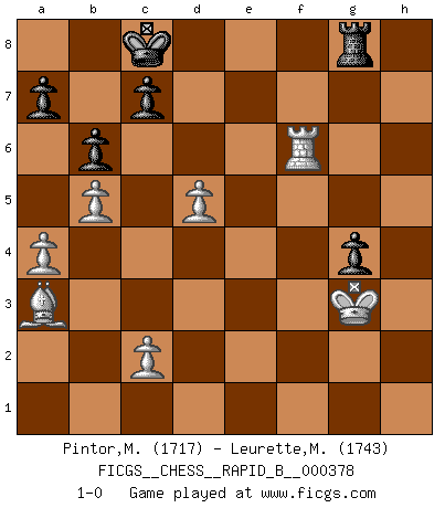 Last move : 1-0 2022 April 30 8:56:30 [Event "FICGS__CHESS__RAPID_B__000378"] [Site "FICGS"] [Date "2022.04.18"] [Round "1"] [White "Pintor,Manuel"] [Black "Leurette,Marc-Antoine"] [Result "1-0"] [WhiteElo "1717"] [BlackElo "1743"] 1.e4 e5 2.f4 exf4 3.Nf3 g5 4.Bc4 d6 5.O-O Be6 6.Bxe6 fxe6 7.d4 Nd7 8.Nc3 Qe7 9.h4 h6 10.Nh2 O-O-O 11.h5 e5 12.d5 Ngf6 13.a4 Nc5 14.Qf3 Rg8 15.Ng4 Nxg4 16.Qxg4+ Qd7 17.Qxd7+ Rxd7 18.b4 Na6 19.Ba3 g4 20.g3 Rg5 21.gxf4 Rxh5 22.fxe5 Rxe5 23.Rxf8+ Rd8 24.Raf1 Rxf8 25.Rxf8+ Kd7 26.Kf2 Re8 27.Rf5 Nb8 28.Kg3 Rg8 29.e5 dxe5 30.Rxe5 Kd6 31.Re6+ Kd7 32.Rxh6 Kc8 33.b5 b6 34.Ne4 Nd7 35.Nf6 Nxf6 36.Rxf6 1-0 KGA : King's knight's gambit Kingside Castling by player White (move 5) Queenside Castling by player Black (move 10) Player White won this chess game. Follow this game move after move (download)In Chess, at least, the brave inherit the earth. (Edmar Mednis) Glücklicherweise sind Großmeister Ruben Fines reine Schachbücher weniger phallozentrisch [als seine Schachpsychologie] und deswegen auch weniger lächerlich. (Nigel Short) ¿Que sería del Ajedrez sin errores graciosos?. (Kurt Richter) Les Echecs représentent une sphère d'idées créatrices basée sur la volonté des deux protagonistes. (Smyslov) Fortune favours the audacious. (Desiderius Erasmus)